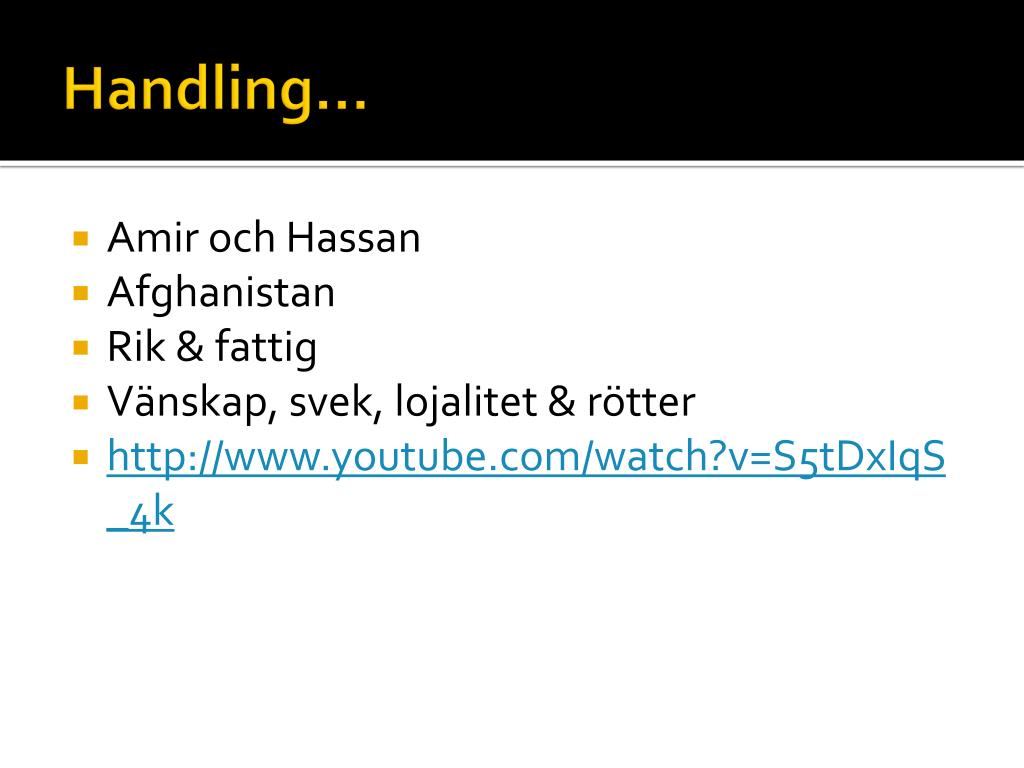 Handling… • Amir och Hassan • Afghanistan • Rik & fattig • Vänskap, svek, lojalitet & rötter • http://www.youtube.com/watch?v=S5tDxIqS_4k