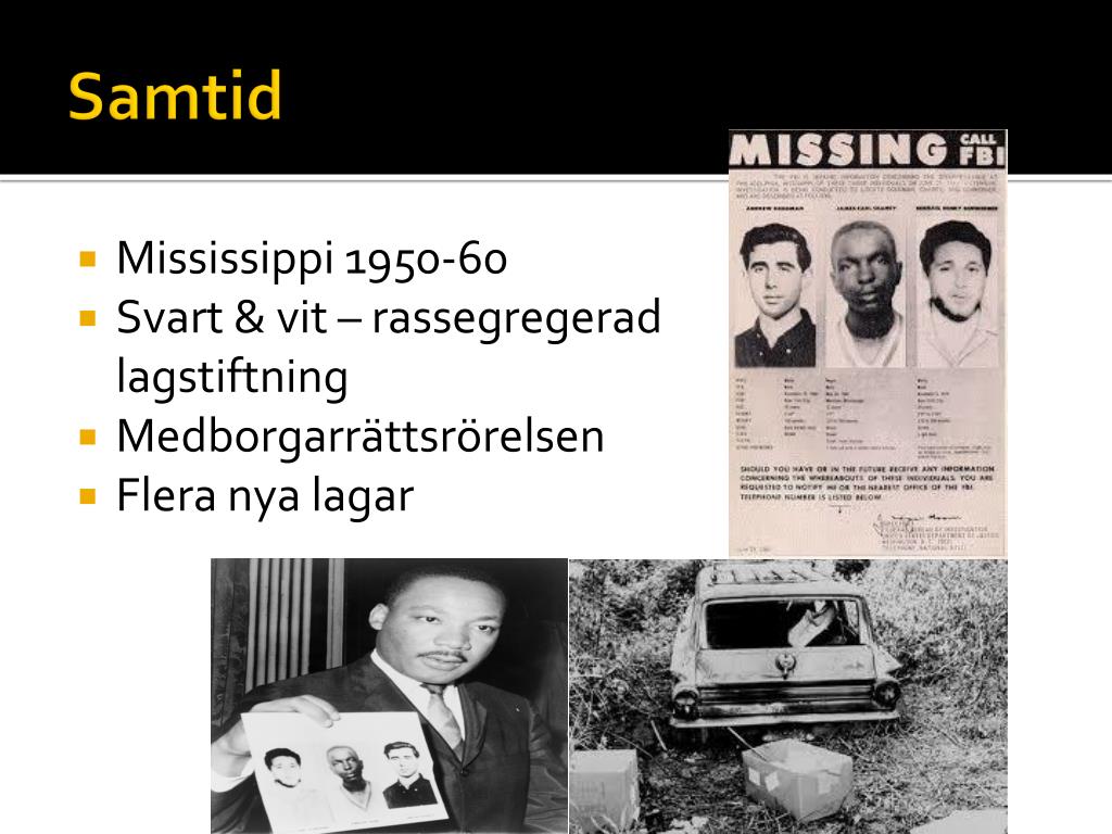 Samtid • Mississippi 1950-60 • Svart & vit – rassegregerad lagstiftning • Medborgarrättsrörelsen • Flera nya lagar