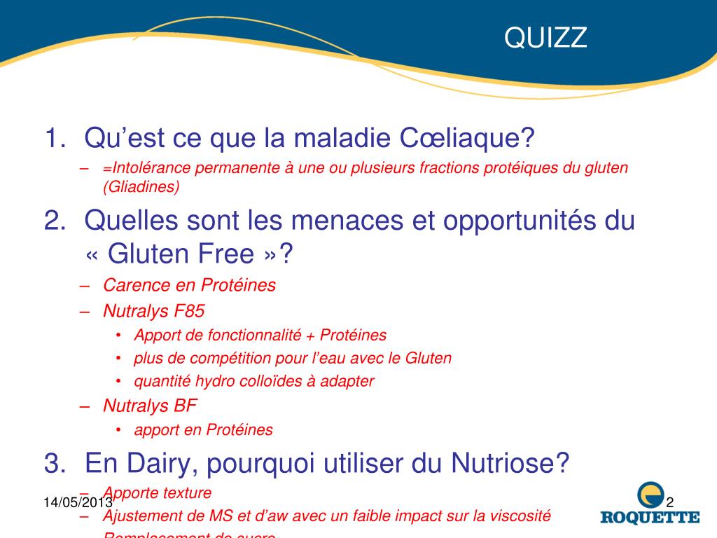 La chronique de l’ingénieur. 14/05/2013 Lestrem Gaëtan Mulliez. QUIZZ . Qu’est ce que la maladie Cœliaque? =Intolérance permanente à une ou plusieurs fractions protéiques du gluten (Gliadines) Quelles sont les menaces et opportunités du « Gluten Free »? Carence en Protéines