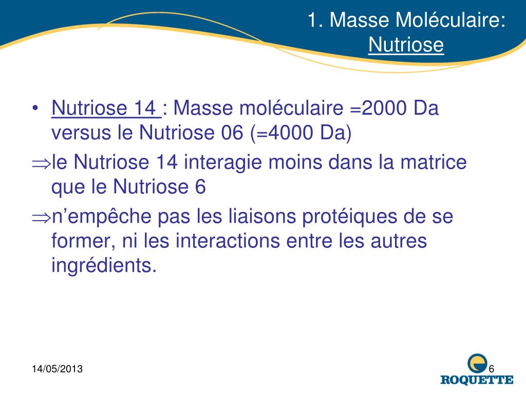 1. Masse Moléculaire:Nutriose • Nutriose 14 : Masse moléculaire =2000 Da versus le Nutriose 06 (=4000 Da) • le Nutriose 14 interagie moins dans la matrice que le Nutriose6 • n’empêche pas les liaisons protéiques de se former, ni les interactions entre les autres ingrédients.