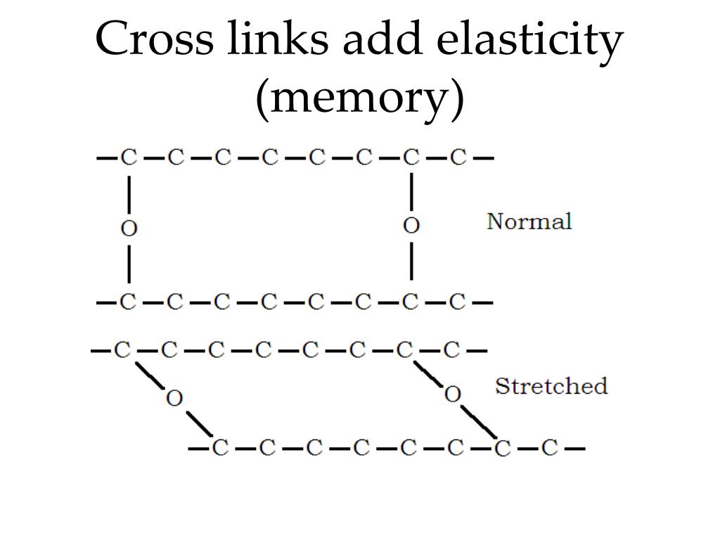 Properties of Polymers Properties are determined by the structure of the molecules and depends on: type(s) of monomer(s) used chain length shape of the chain number and type of cross-linking