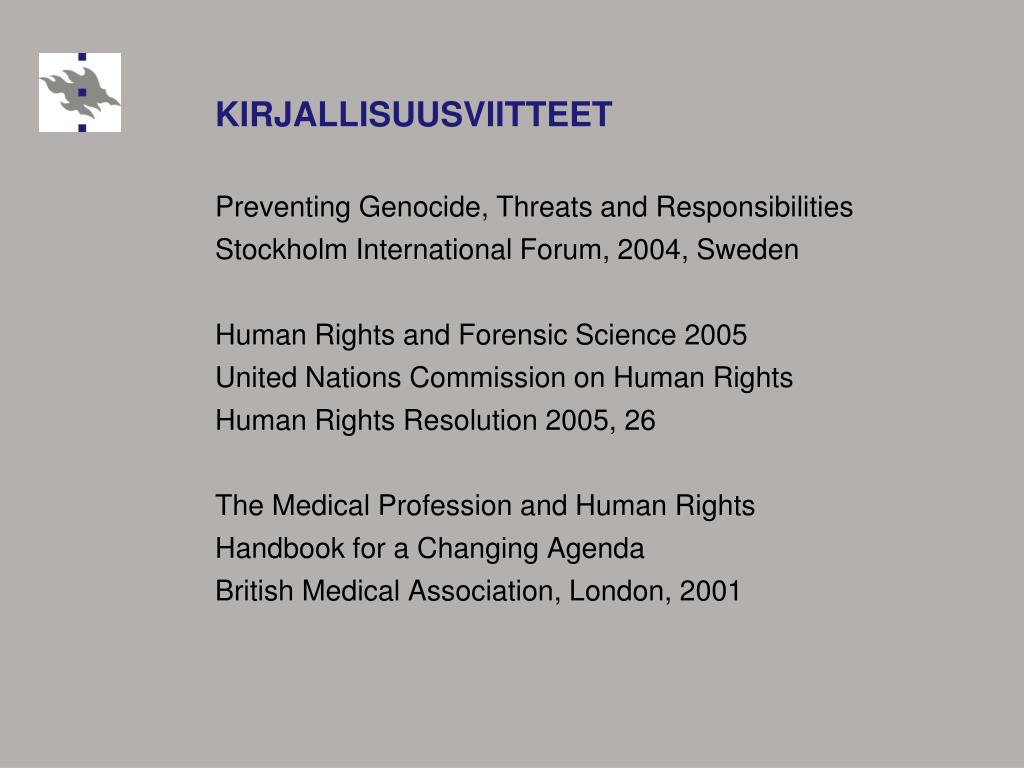 KIRJALLISUUSVIITTEET Preventing Genocide, Threats and Responsibilities Stockholm International Forum, 2004, Sweden Human Rights and Forensic Science 2005 United Nations Commission on Human Rights Human Rights Resolution 2005, 26 The Medical Profession and Human Rights Handbook for a Changing Agenda British Medical Association, London, 2001