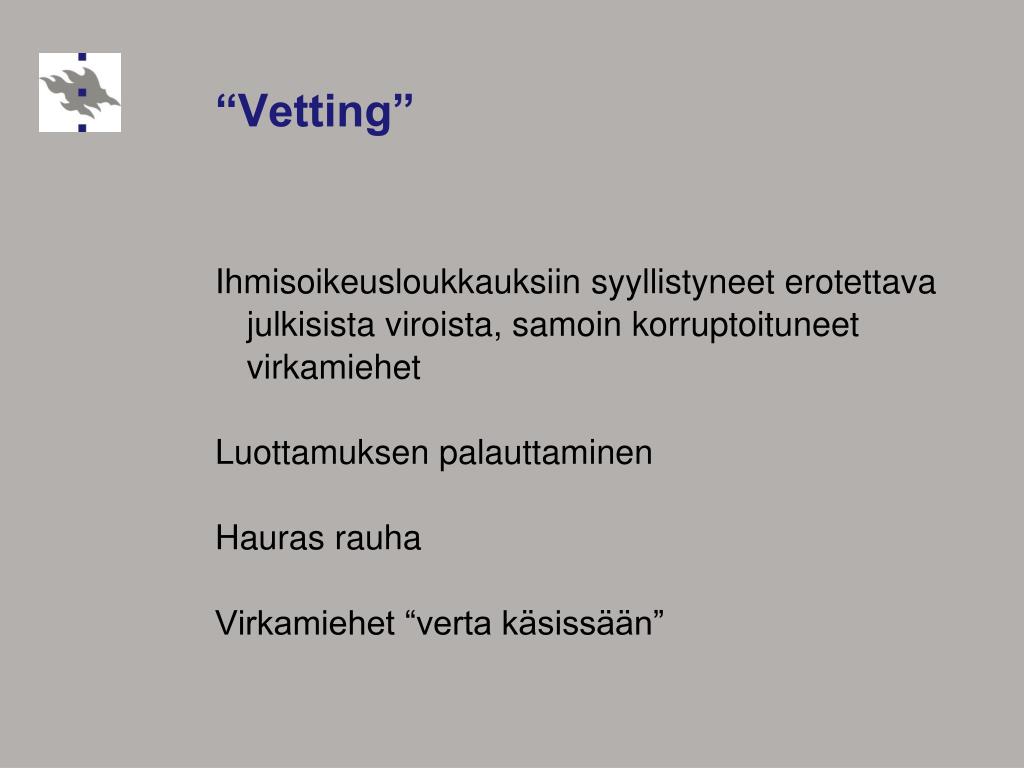 “Vetting” Ihmisoikeusloukkauksiin syyllistyneet erotettava julkisista viroista, samoin korruptoituneet virkamiehet Luottamuksen palauttaminen Hauras rauha Virkamiehet “verta käsissään”