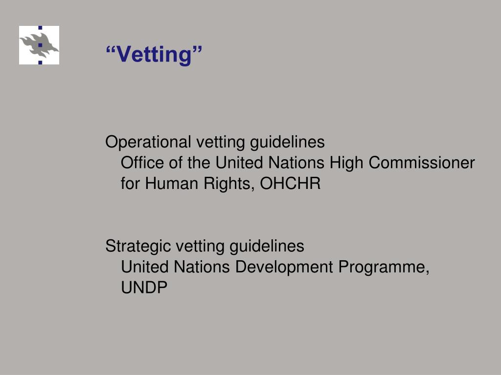 “Vetting” Operational vetting guidelines Office of the United Nations High Commissioner for Human Rights, OHCHR Strategic vetting guidelines United Nations Development Programme, UNDP