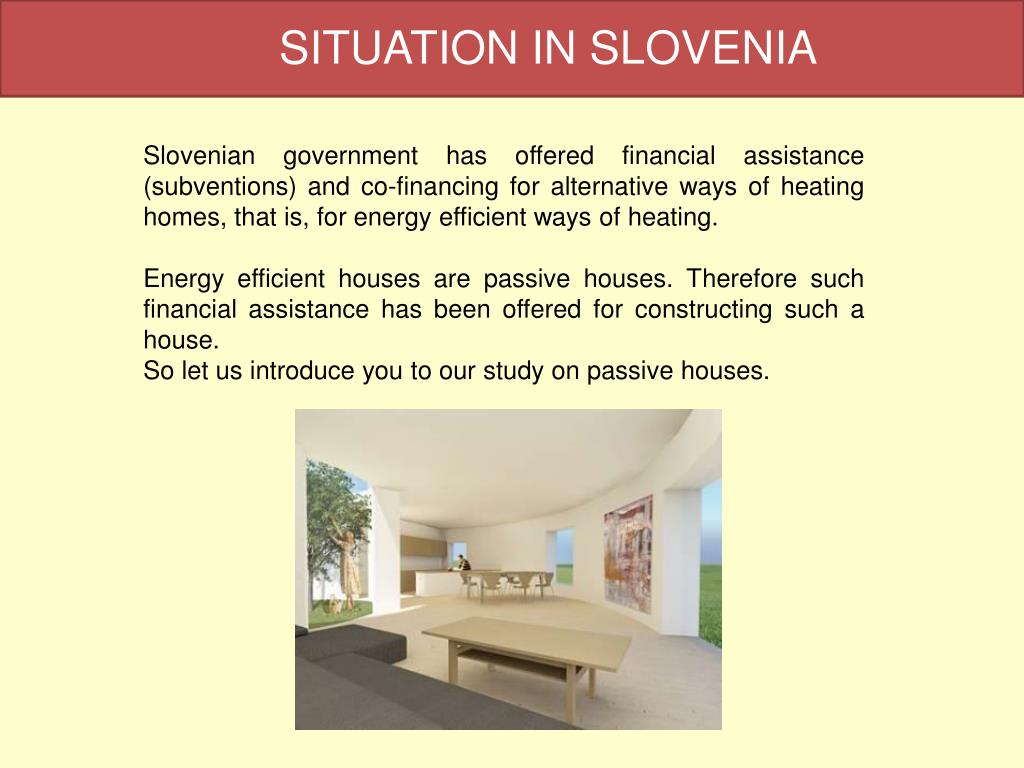 SITUATION IN SLOVENIA Slovenian government has offered financial assistance (subventions) and co-financing for alternative ways of heating homes, that is, for energy efficient ways of heating. Energy efficient houses are passive houses. Therefore such financial assistance has been offered for constructing such a house. So let us introduce you to our study on passive houses.