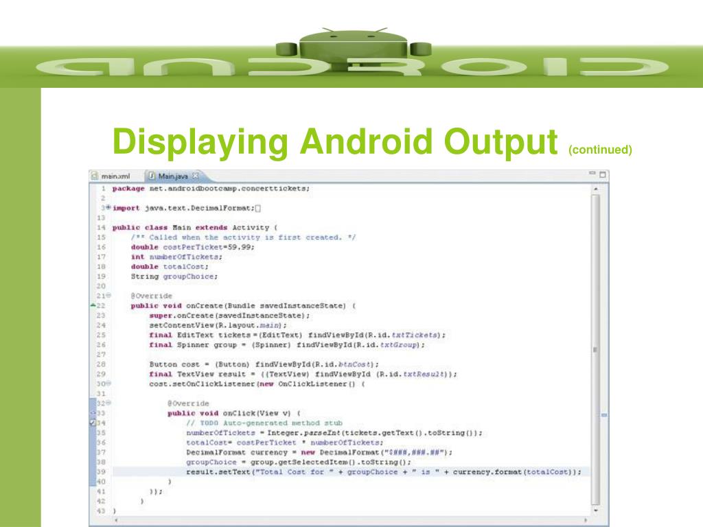 Simplifying User Input (continued) Coding the EditText Class for the Text Field A variable is used in programming to contain data that changes during the execution of a program Final variables can be initialized but cannot be changed Insert this code to create a variable: final EditText tickets=(EditText)findViewById(R.id.txtTickets);