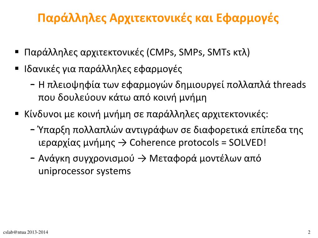 Παράλληλες Αρχιτεκτονικές και Εφαρμογές • Παράλληλες αρχιτεκτονικές (CMPs, SMPs, SMTs κτλ) • Ιδανικές για παράλληλες εφαρμογές • Η πλειοψηφία των εφαρμογών δημιουργεί πολλαπλά threads που δουλεύουν κάτω από κοινή μνήμη • Κίνδυνοι με κοινή μνήμησε παράλληλες αρχιτεκτονικές: • Ύπαρξη πολλαπλών αντιγράφων σε διαφορετικά επίπεδα της ιεραρχίας μνήμης → Coherence protocols = SOLVED! • Ανάγκη συγχρονισμού → Μεταφορά μοντέλων από uniprocessor systems