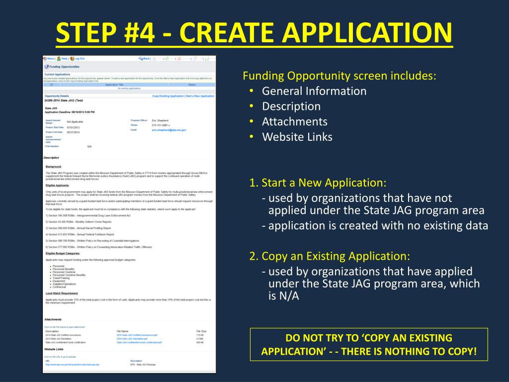 STEP #4 - CREATE APPLICATION Funding Opportunity screen includes: • General Information • Description • Attachments • Website Links 1. Start a New Application: • used by organizations that have not applied under the State JAG program area • application is created with no existing data 2. Copy an Existing Application: • used by organizations that have applied under the State JAG program area, which is N/A DO NOT TRY TO ‘COPY AN EXISTING APPLICATION’ - - THERE IS NOTHING TO COPY!