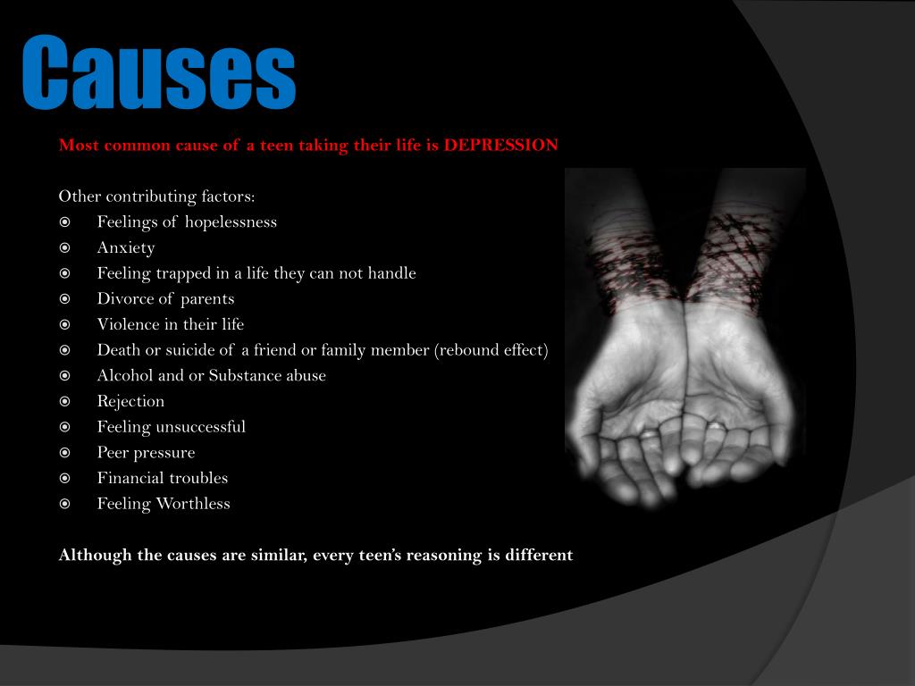 Causes Most common cause of a teen taking their life is DEPRESSION Other contributing factors: • Feelings of hopelessness • Anxiety • Feeling trapped in a life they can not handle • Divorce of parents • Violence in their life • Death or suicide of a friend or family member (rebound effect) • Alcohol and or Substance abuse • Rejection • Feeling unsuccessful • Peer pressure • Financial troubles • Feeling Worthless Although the causes are similar, every teen’s reasoning is different