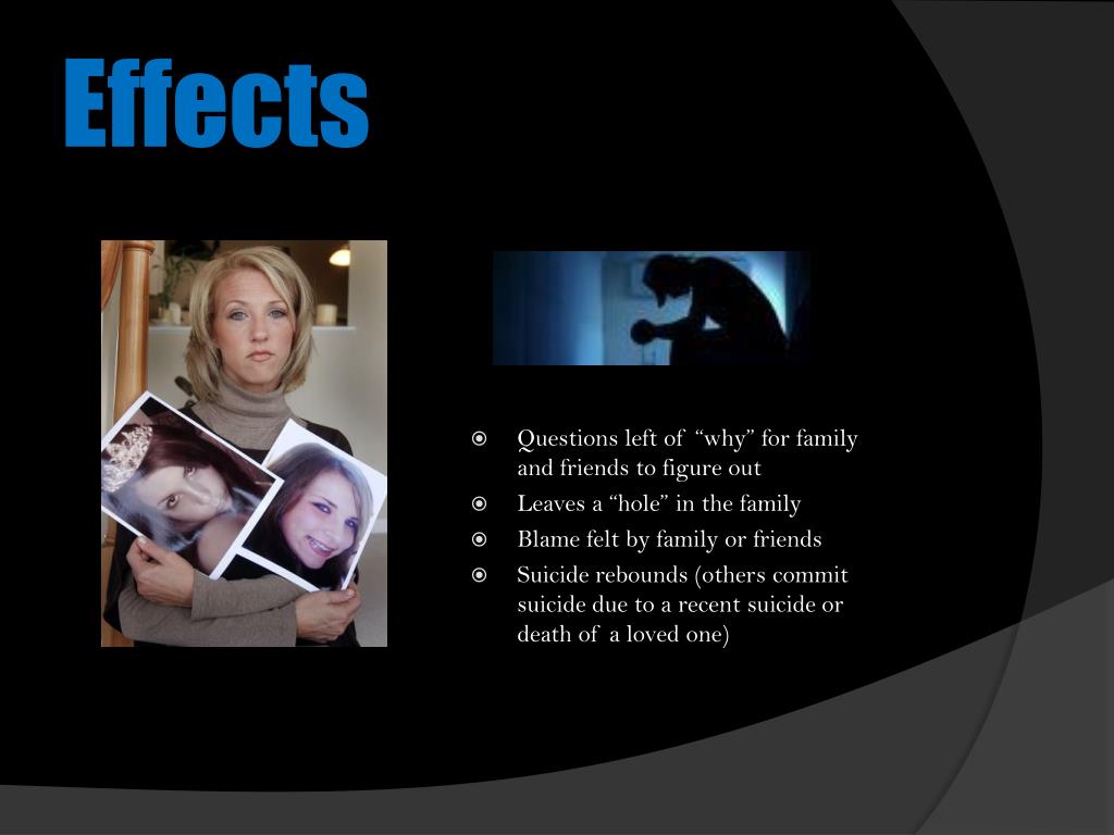 Effects • Questions left of “why” for family and friends to figure out • Leaves a “hole” in the family • Blame felt by family or friends • Suicide rebounds (others commit suicide due to a recent suicide or death of a loved one)