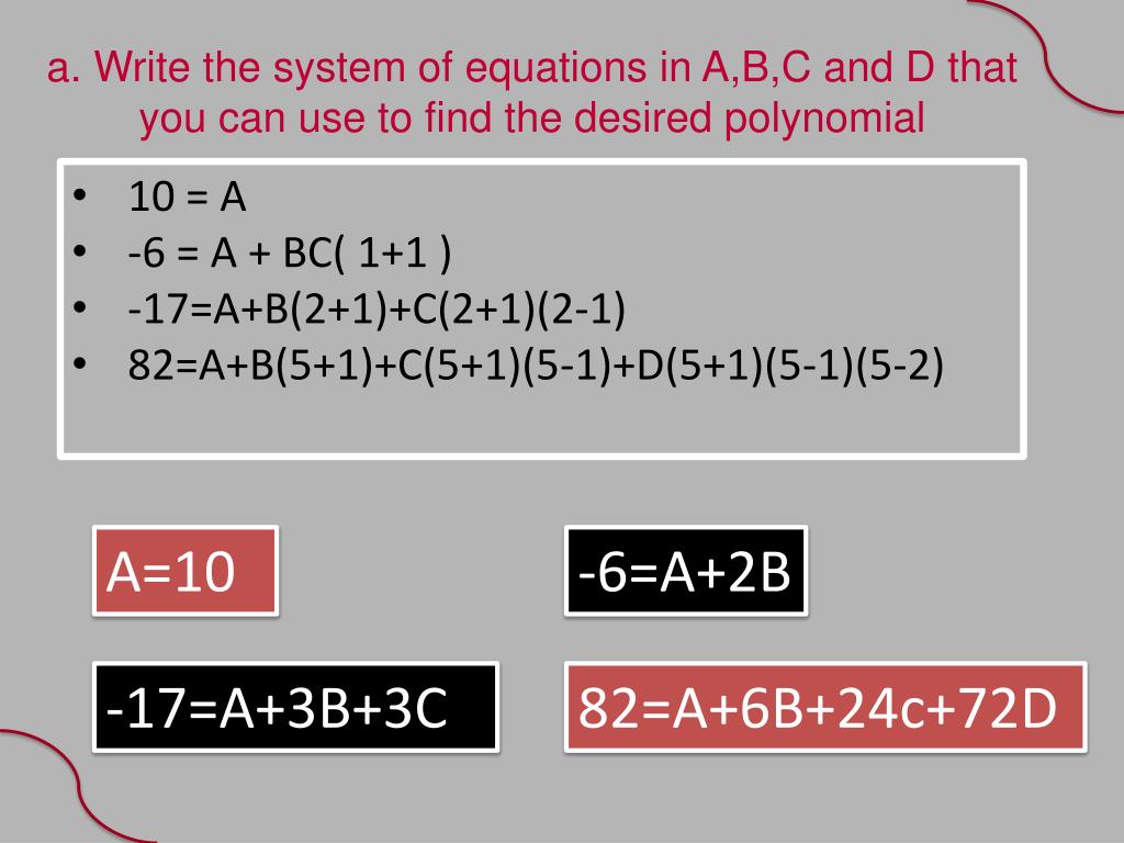 a. Write the system of equations in A,B,C and D that you can use to find the desired polynomial • 10 = A • -6 = A + BC( 1+1 ) • -17=A+B(2+1)+C(2+1)(2-1) • 82=A+B(5+1)+C(5+1)(5-1)+D(5+1)(5-1)(5-2) A=10 -6=A+2B -17=A+3B+3C 82=A+6B+24c+72D