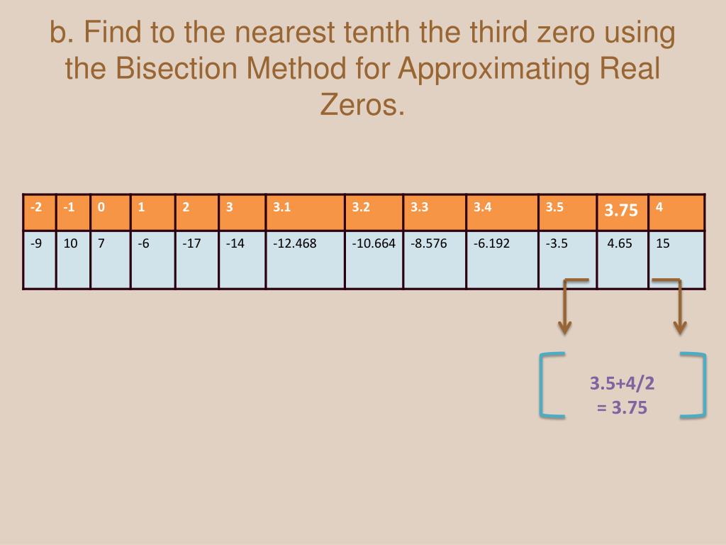 b. Find to the nearest tenth the third zero using the Bisection Method for Approximating Real Zeros. 3.5+4/2 = 3.75