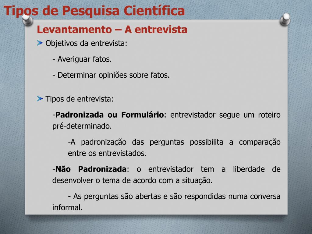 Tipos de Pesquisa Científica Levantamento – A entrevista • Objetivos da entrevista: • - Averiguar fatos. • - Determinar opiniões sobre fatos. • Tipos de entrevista: • -Padronizada ou Formulário: entrevistador segue um roteiro pré-determinado. • -A padronização das perguntas possibilita a comparação entre os entrevistados. • -Não Padronizada: o entrevistador tem a liberdade de desenvolver o tema de acordo com a situação. • - As perguntas são abertas e são respondidas numa conversa informal.