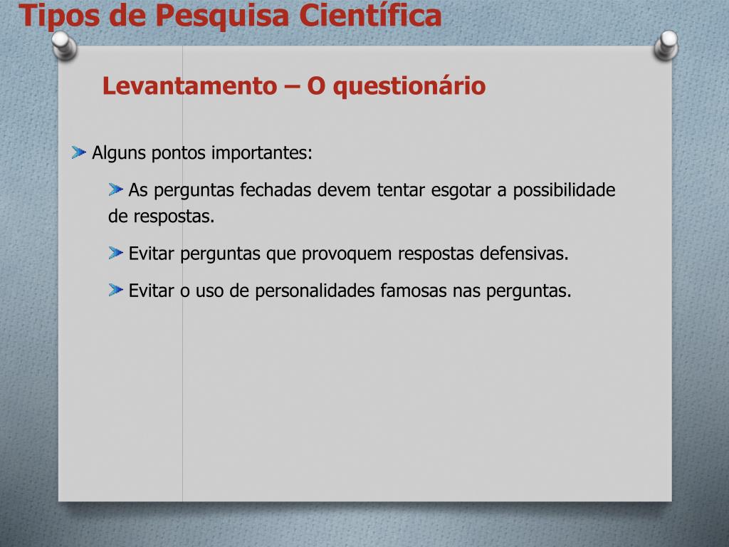 Tipos de Pesquisa Científica Levantamento – O questionário • Alguns pontos importantes: • As perguntas fechadas devem tentar esgotar a possibilidade de respostas. • Evitar perguntas que provoquem respostas defensivas. • Evitar o uso de personalidades famosas nas perguntas.