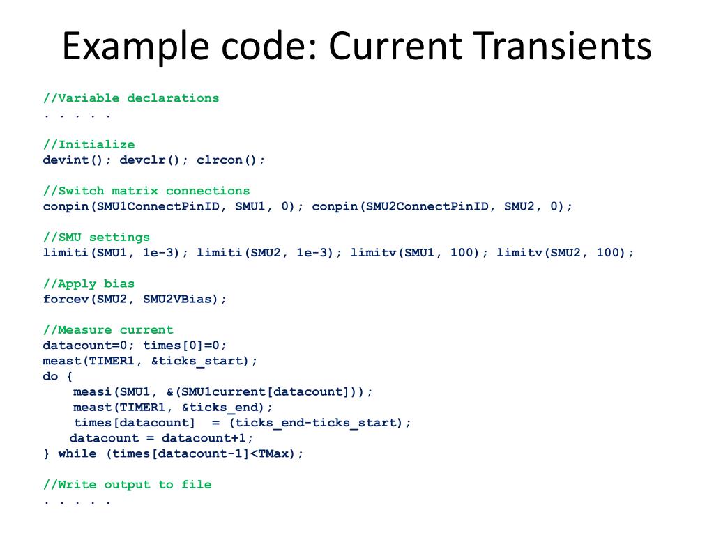 Example code: Current Transients //Variable declarations . . . . . //Initialize devint(); devclr(); clrcon(); //Switch matrix connections conpin(SMU1ConnectPinID, SMU1, 0); conpin(SMU2ConnectPinID, SMU2, 0); //SMU settings limiti(SMU1, 1e-3); limiti(SMU2, 1e-3); limitv(SMU1, 100); limitv(SMU2, 100); //Apply bias forcev(SMU2, SMU2VBias); //Measure current datacount=0; times[0]=0; meast(TIMER1, &ticks_start); do { measi(SMU1, &(SMU1current[datacount])); meast(TIMER1, &ticks_end); times[datacount] = (ticks_end-ticks_start); datacount = datacount+1; } while (times[datacount-1]<TMax); //Write output to file . . . . .