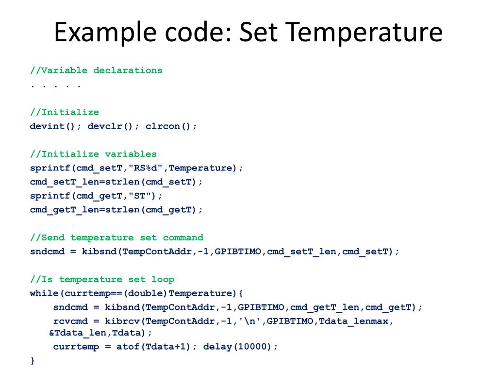 Example code: Set Temperature //Variable declarations . . . . . //Initialize devint(); devclr(); clrcon(); //Initialize variables sprintf(cmd_setT,"RS%d",Temperature); cmd_setT_len=strlen(cmd_setT); sprintf(cmd_getT,"ST"); cmd_getT_len=strlen(cmd_getT); //Send temperature set command sndcmd = kibsnd(TempContAddr,-1,GPIBTIMO,cmd_setT_len,cmd_setT); //Is temperature set loop while(currtemp==(double)Temperature){ sndcmd = kibsnd(TempContAddr,-1,GPIBTIMO,cmd_getT_len,cmd_getT); rcvcmd = kibrcv(TempContAddr,-1,'\n',GPIBTIMO,Tdata_lenmax, &Tdata_len,Tdata); currtemp = atof(Tdata+1); delay(10000); }