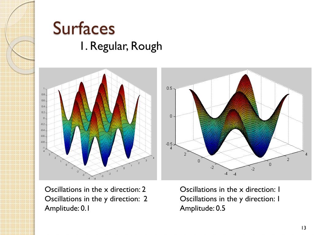 Surfaces 1. Regular, Rough Oscillations in the x direction: 2 Oscillations in the y direction: 2 Amplitude: 0.1 Oscillations in the x direction: 1 Oscillations in the y direction: 1 Amplitude: 0.5