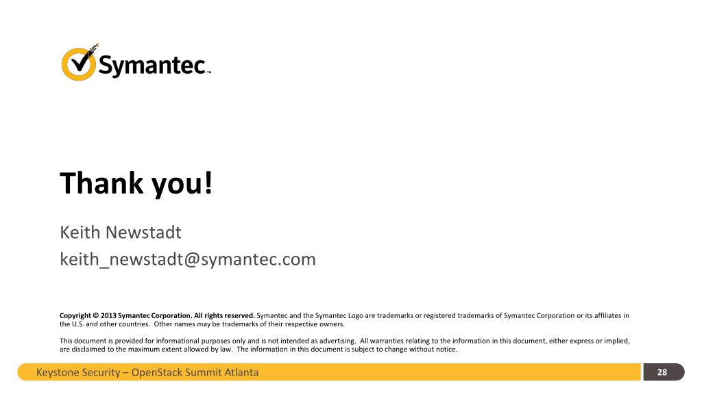 Keystone and Standard Protocols • Interest in industry standard Identity protocols for OpenStack • Symantec has been through a migration like this before • Community has already summited blueprints • Benefits • Single sign on • Improved integration • Control over credentials • Unified authentication experience • Symantec will look to participate in this effort Keystone Security – OpenStack Summit Atlanta