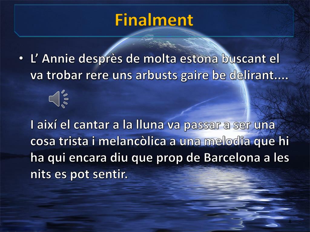 Finalment • L’ Annie desprès de molta estona buscant el va trobar rere uns arbusts gaire be delirant....I així el cantar a la lluna va passar a ser una cosa trista i melancòlica a una melodia que hi ha qui encara diu que prop de Barcelona a les nits es pot sentir.