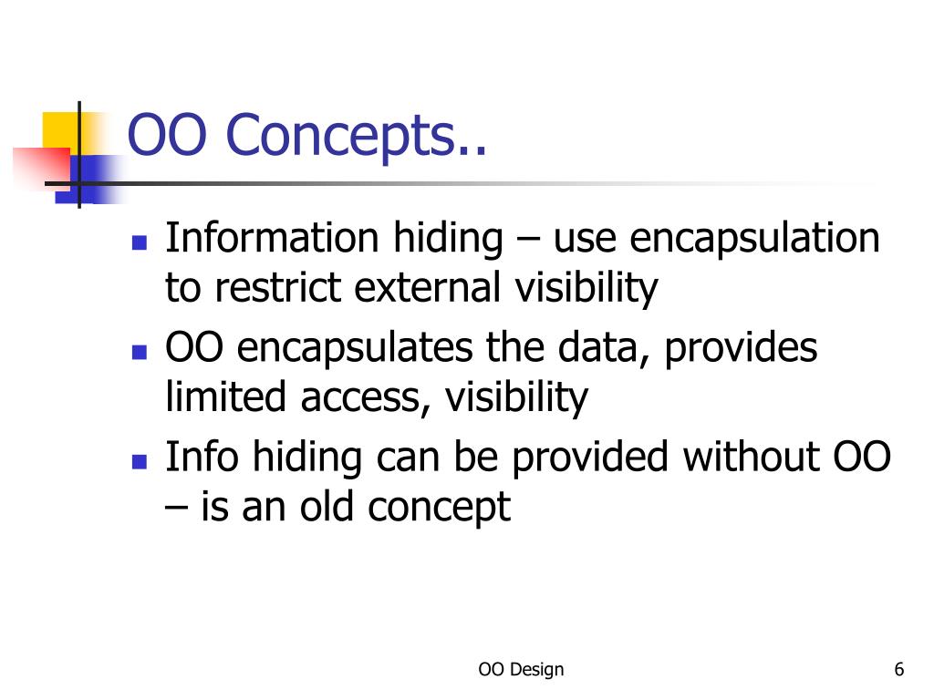 OO Concepts.. • Information hiding – use encapsulation to restrict external visibility • OO encapsulates the data, provides limited access, visibility • Info hiding can be provided without OO – is an old concept OO Design