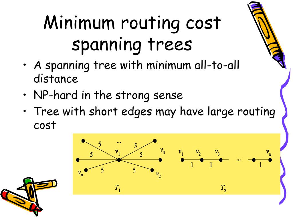 Minimum routing cost spanning trees • A spanning tree with minimum all-to-all distance • NP-hard in the strong sense • Tree with short edges may have large routing cost