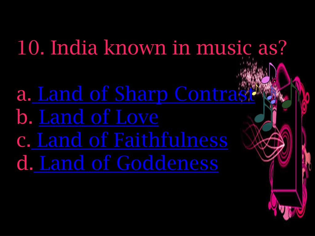 10. India known in music as? Land of Sharp Contrast Land of Love Land of Faithfulness Land of Goddeness