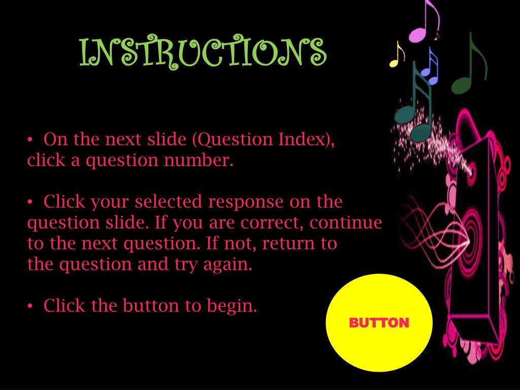 INSTRUCTIONS • On the next slide (Question Index), • click a question number. • Click your selected response on the • question slide. If you are correct, continue • to the next question. If not, return to • the question and try again. • Click the button to begin. BUTTON