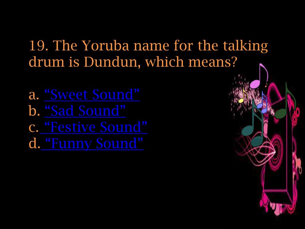 19. The Yoruba name for the talking drum is Dundun, which means? “Sweet Sound” “Sad Sound” “Festive Sound” “Funny Sound”