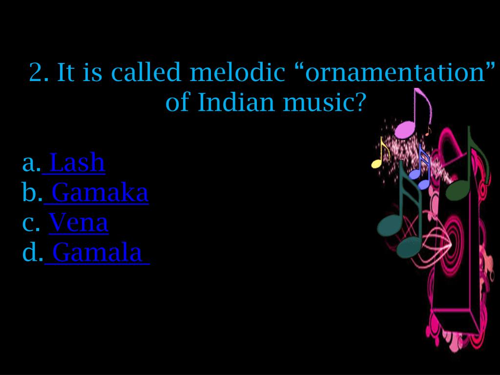 2. It is called melodic “ornamentation” of Indian music? Lash Gamaka Vena Gamala