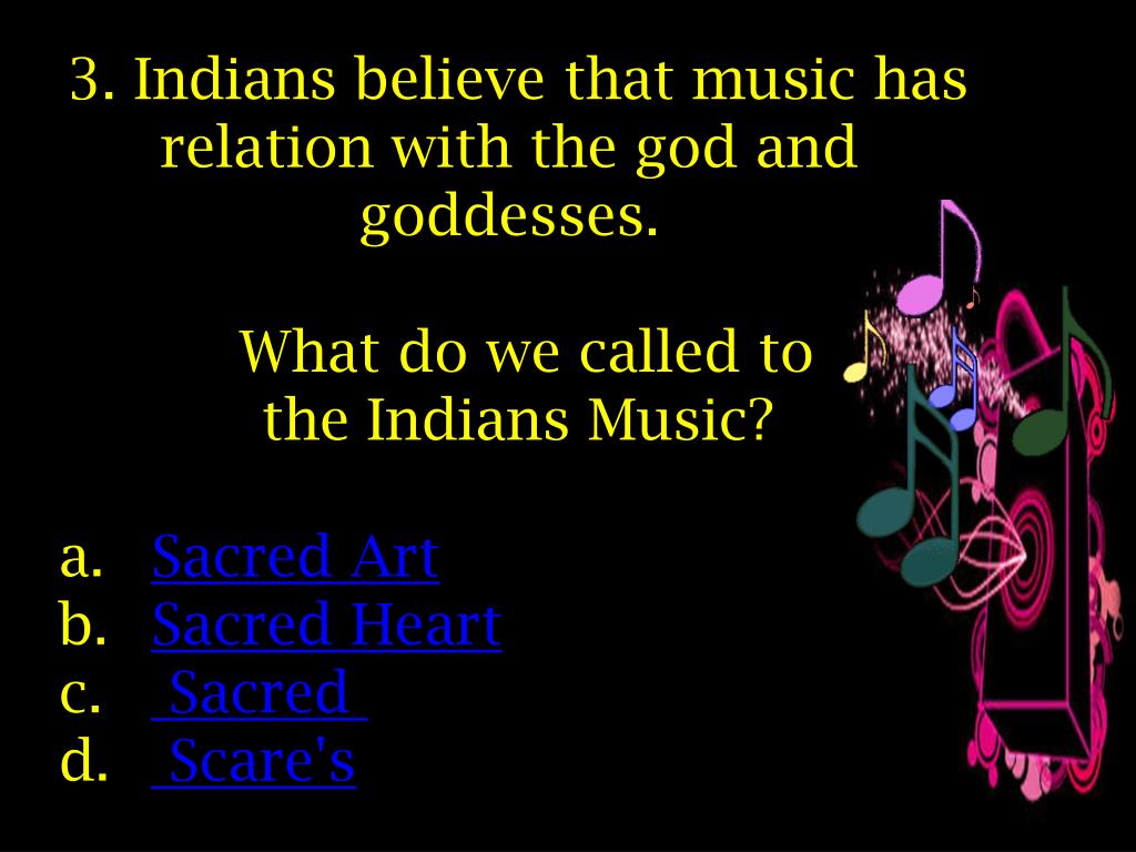 3. Indians believe that music has relation with the god and goddesses. What do we called to the Indians Music? Sacred Art Sacred Heart Sacred Scare's