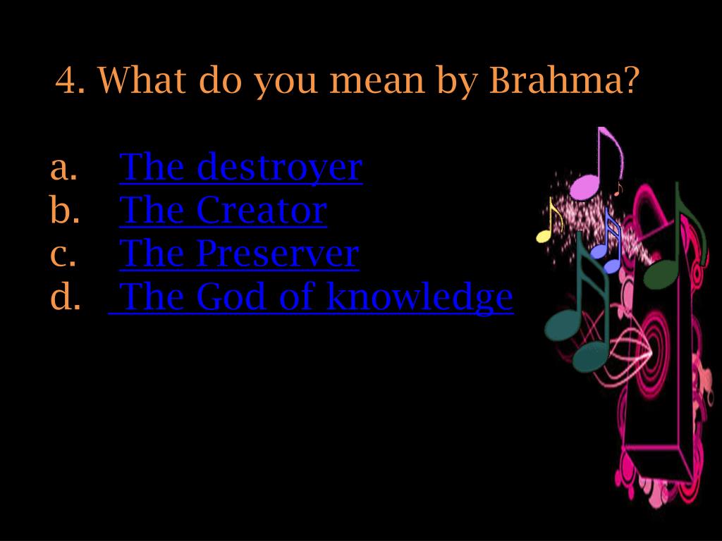4. What do you mean by Brahma? The destroyer The Creator The Preserver The God of knowledge