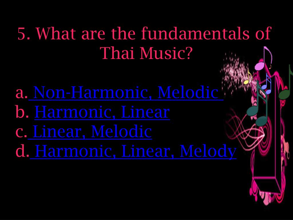 5. What are the fundamentals of Thai Music? Non-Harmonic, Melodic Harmonic, Linear Linear, Melodic Harmonic, Linear, Melody