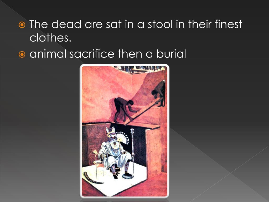 The dead are sat in a stool in their finest clothes. • animal sacrifice then a burial