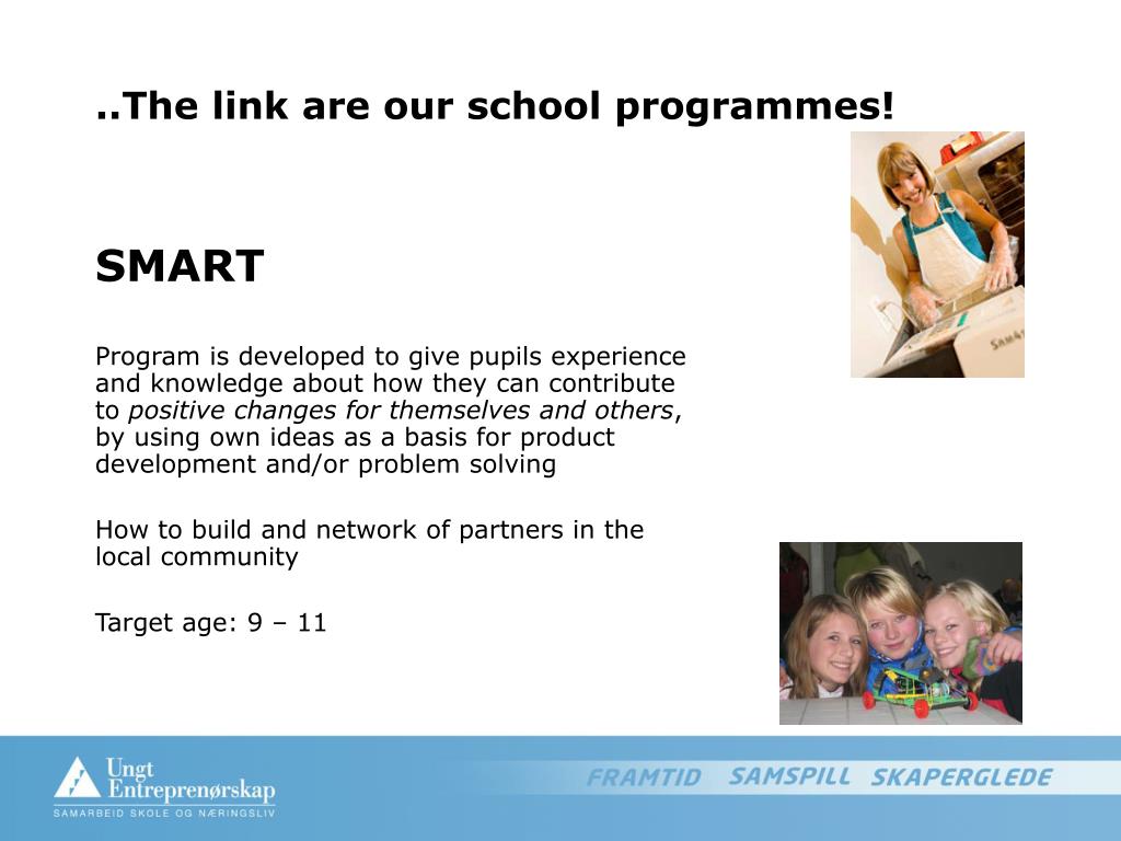 ..The link are our school programmes! SMART Program is developed to give pupils experience and knowledge about how they can contribute to positive changes for themselves and others, by using own ideas as a basis for product development and/or problem solving How to build and network of partners in the local community Target age: 9 – 11