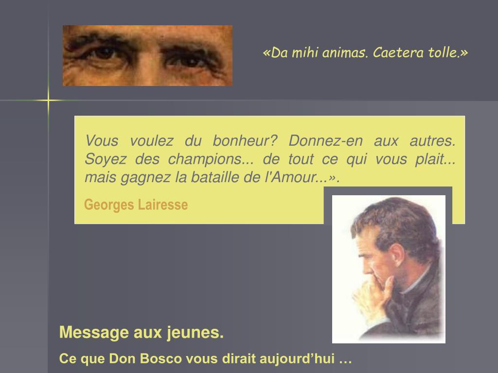 «Da mihi animas. Caetera tolle.» Vous voulez du bonheur? Donnez-en aux autres. Soyez des champions... de tout ce qui vous plait... mais gagnez la bataille de l'Amour...». Georges Lairesse Message aux jeunes. Ce que Don Bosco vous dirait aujourd’hui …