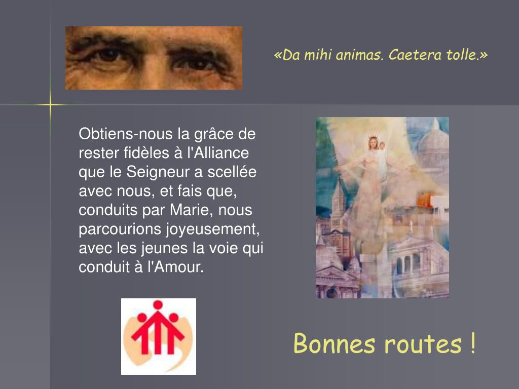 «Da mihi animas. Caetera tolle.» Obtiens-nous la grâce de rester fidèles à l'Alliance que le Seigneur a scellée avec nous, et fais que, conduits par Marie, nous parcourions joyeusement, avec les jeunes la voie qui conduit à l'Amour. Bonnes routes !