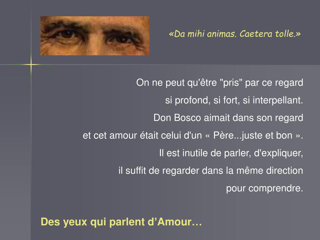 «Da mihi animas. Caetera tolle.» On ne peut qu'être "pris" par ce regard si profond, si fort, si interpellant. Don Bosco aimait dans son regard et cet amour était celui d'un « Père...juste et bon ». Il est inutile de parler, d'expliquer, il suffit de regarder dans la même direction pour comprendre. Des yeux qui parlent d’Amour…