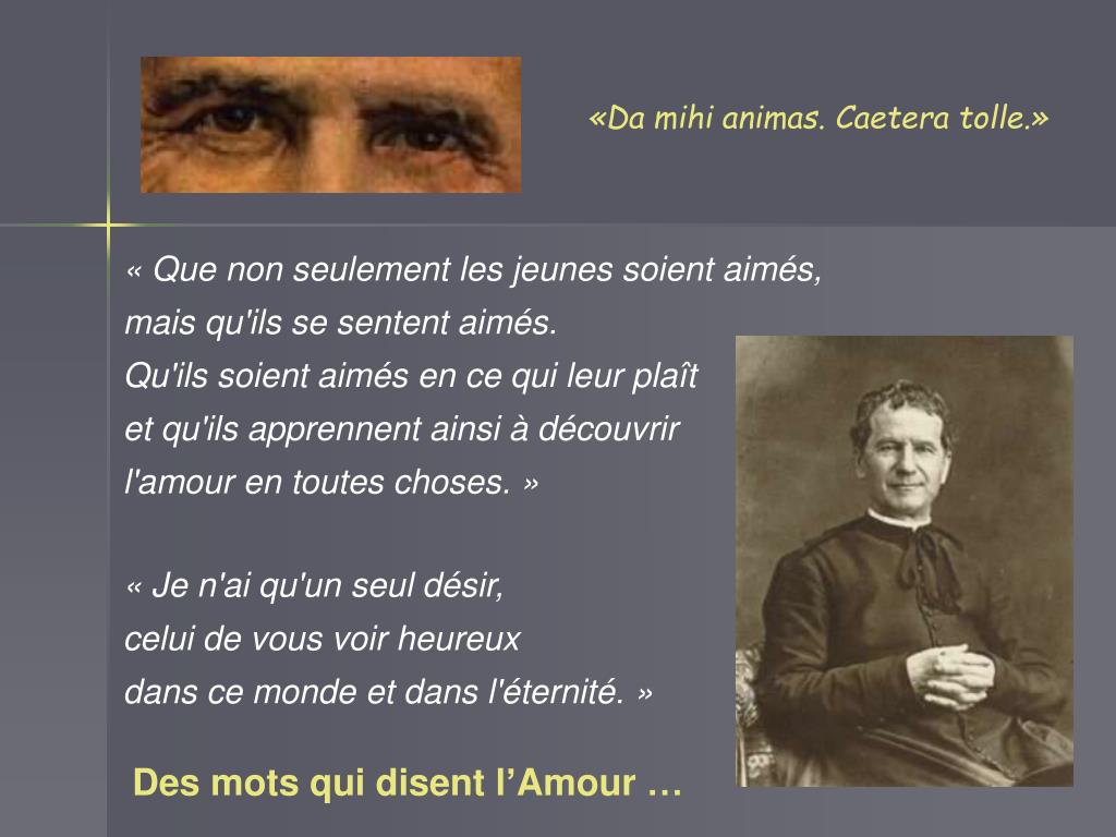 «Da mihi animas. Caetera tolle.» « Que non seulement les jeunes soient aimés, mais qu'ils se sentent aimés. Qu'ils soient aimés en ce qui leur plaît et qu'ils apprennent ainsi à découvrir l'amour en toutes choses. » « Je n'ai qu'un seul désir, celui de vous voir heureux dans ce monde et dans l'éternité. » Des mots qui disent l’Amour …