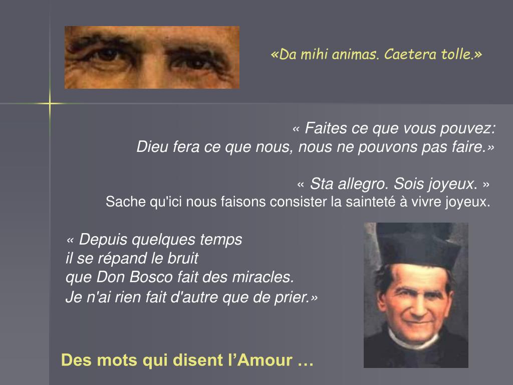 «Da mihi animas. Caetera tolle.» « Faites ce que vous pouvez: Dieu fera ce que nous, nous ne pouvons pas faire.» « Sta allegro. Sois joyeux. » Sache qu'ici nous faisons consister la sainteté à vivre joyeux. « Depuis quelques temps il se répand le bruit que Don Bosco fait des miracles. Je n'ai rien fait d'autre que de prier.» Des mots qui disent l’Amour …