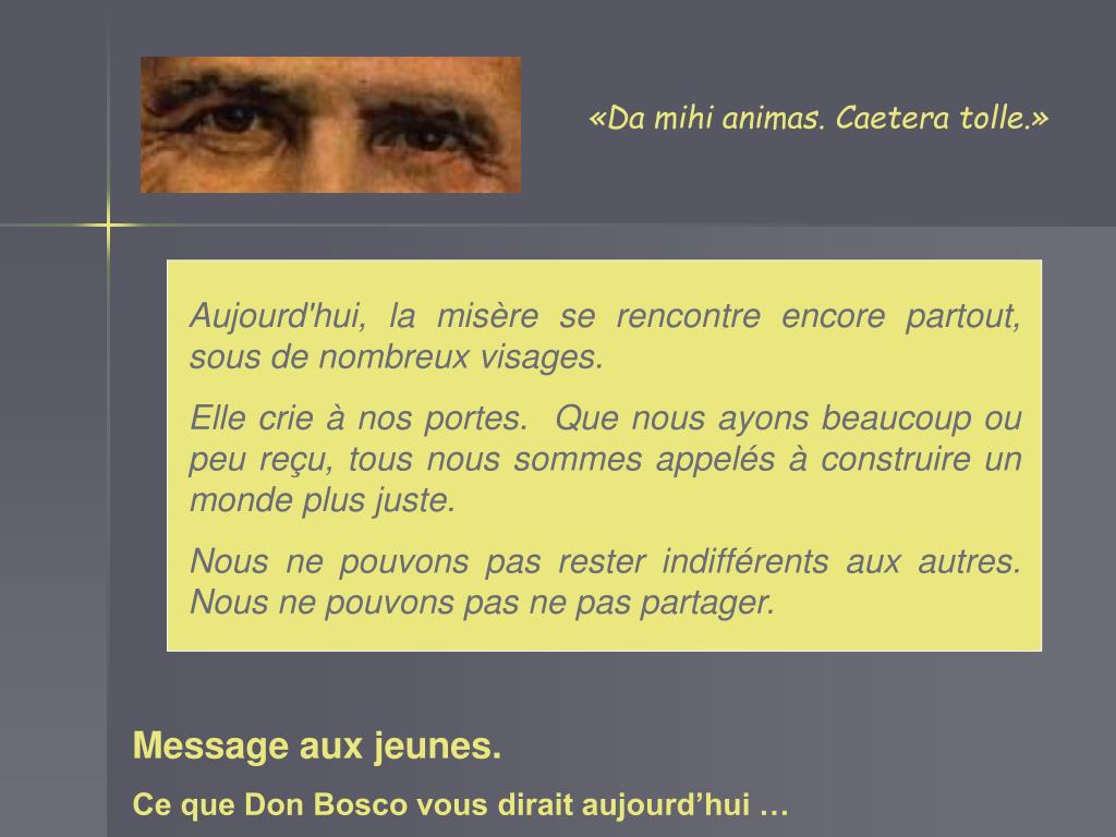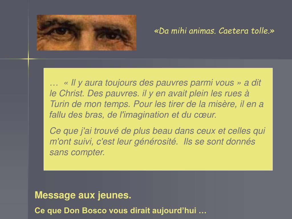 «Da mihi animas. Caetera tolle.» … « Il y aura toujours des pauvres parmi vous » a dit le Christ. Des pauvres. il y en avait plein les rues à Turin de mon temps. Pour les tirer de la misère, il en a fallu des bras, de l'imagination et du cœur. Ce que j'ai trouvé de plus beau dans ceux et celles qui m'ont suivi, c'est leur générosité. Ils se sont donnés sans compter. Message aux jeunes. Ce que Don Bosco vous dirait aujourd’hui …