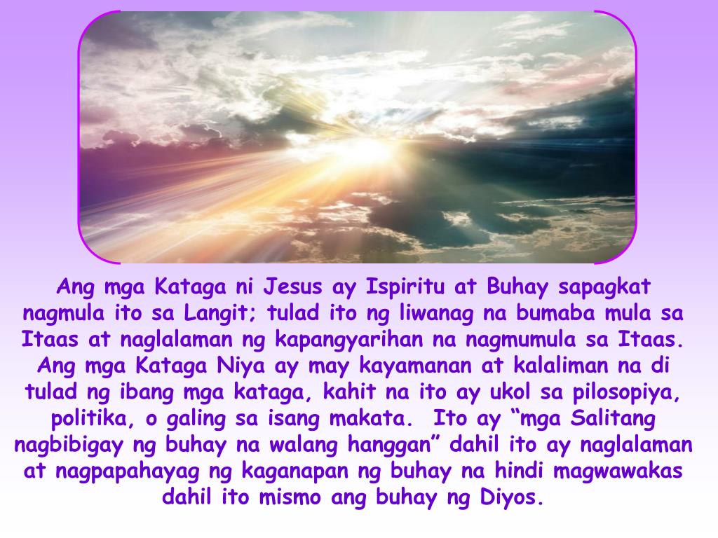 Ang mga Kataga ni Jesus ay Ispiritu at Buhay sapagkat nagmula ito sa Langit; tulad ito ng liwanag na bumaba mula sa Itaas at naglalaman ng kapangyarihan na nagmumula sa Itaas. Ang mga Kataga Niya ay may kayamanan at kalaliman na di tulad ng ibang mga kataga, kahit na ito ay ukol sa pilosopiya, politika, o galing sa isang makata. Ito ay “mga Salitang nagbibigay ng buhay na walang hanggan” dahil ito ay naglalaman at nagpapahayag ng kaganapan ng buhay na hindi magwawakas dahil ito mismo ang buhay ng Diyos.