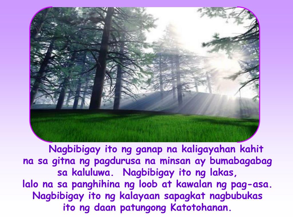 Nagbibigay ito ng ganap na kaligayahan kahit na sa gitna ng pagdurusa na minsan ay bumabagabag sa kaluluwa. Nagbibigay ito ng lakas, lalo na sa panghihina ng loob at kawalan ng pag-asa. Nagbibigay ito ng kalayaan sapagkat nagbubukas ito ng daan patungong Katotohanan.