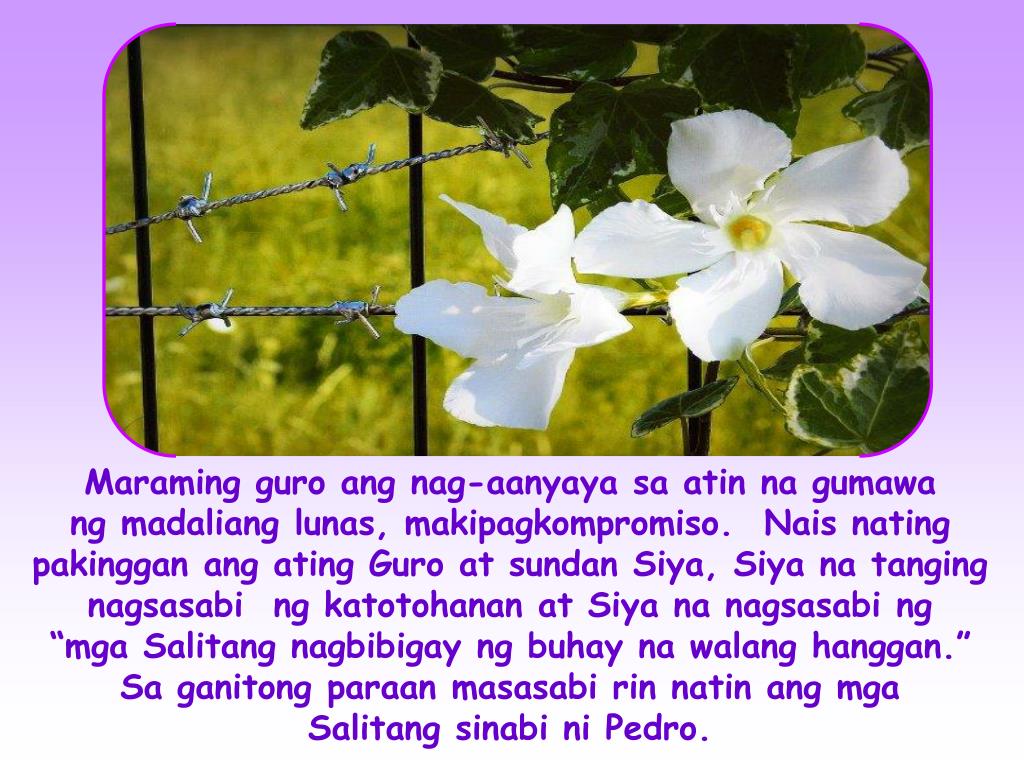 Maraming guro ang nag-aanyaya sa atin na gumawa ng madaliang lunas, makipagkompromiso. Nais nating pakinggan ang ating Guro at sundan Siya, Siya na tanging nagsasabi ng katotohanan at Siya na nagsasabi ng “mga Salitang nagbibigay ng buhay na walang hanggan.” Sa ganitong paraan masasabi rin natin ang mga Salitang sinabi ni Pedro.