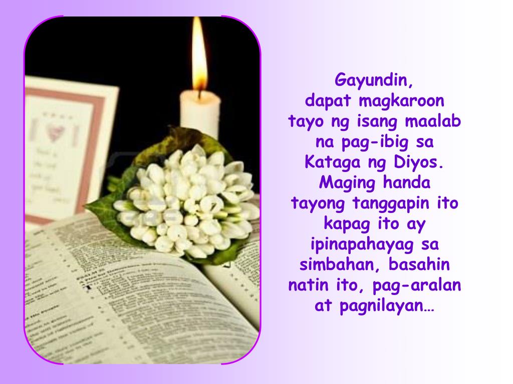 Gayundin, dapat magkaroon tayo ng isang maalab na pag-ibig sa Kataga ng Diyos. Maging handa tayong tanggapin ito kapag ito ay ipinapahayag sa simbahan, basahin natin ito, pag-aralan at pagnilayan…
