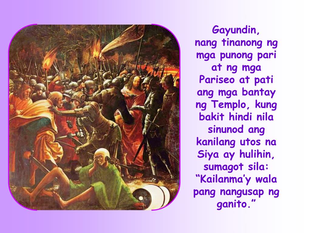 Gayundin, nang tinanong ng mga punong pari at ng mga Pariseo at pati ang mga bantay ng Templo, kung bakit hindi nila sinunod ang kanilang utos na Siya ay hulihin, sumagot sila: “Kailanma’y wala pang nangusap ng ganito.”