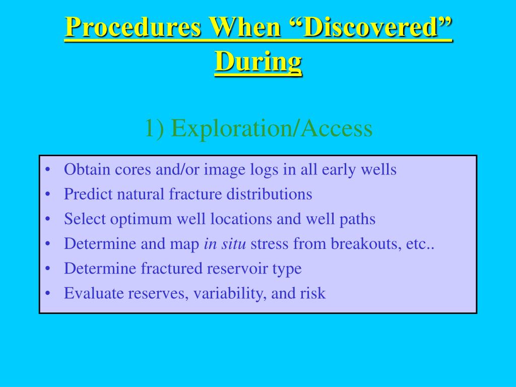 Procedures When “Discovered” During1) Exploration/Access • Obtain cores and/or image logs in all early wells • Predict natural fracture distributions • Select optimum well locations and well paths • Determine and map in situ stress from breakouts, etc.. • Determine fractured reservoir type • Evaluate reserves, variability, and risk