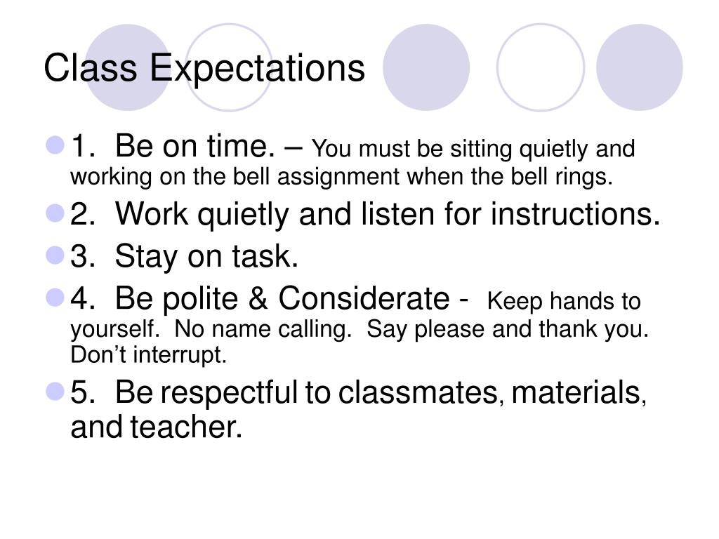 Class Expectations • 1. Be on time. – You must be sitting quietly and working on the bell assignment when the bell rings. • 2. Work quietly and listen for instructions. • 3. Stay on task. • 4. Be polite & Considerate - Keep hands to yourself. No name calling. Say please and thank you. Don’t interrupt. • 5. Berespectfultoclassmates, materials, andteacher.