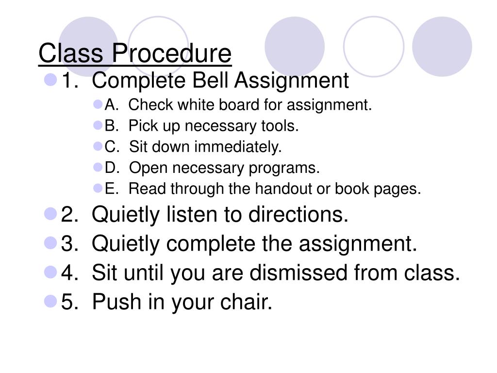 Class Procedure • 1. Complete Bell Assignment • A. Check white board for assignment. • B. Pick up necessary tools. • C. Sit down immediately. • D. Open necessary programs. • E. Read through the handout or book pages. • 2. Quietly listen to directions. • 3. Quietly complete the assignment. • 4. Sit until you are dismissed from class. • 5. Push in your chair.