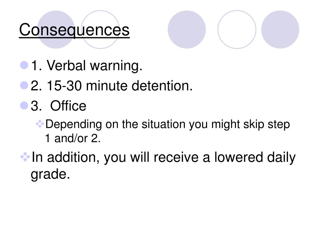 Consequences • 1. Verbal warning. • 2. 15-30 minute detention. • 3. Office • Depending on the situation you might skip step 1 and/or 2. • In addition, you will receive a lowered daily grade.