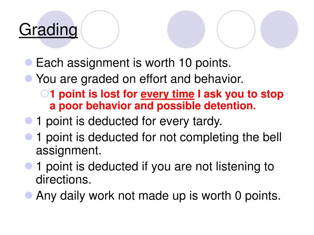 Grading • Each assignment is worth 10 points. • You are graded on effort and behavior. • 1 point is lost for every time I ask you to stop a poor behavior and possible detention. • 1 point is deducted for every tardy. • 1 point is deducted for not completing the bell assignment. • 1 point is deducted if you are not listening to directions. • Any daily work not made up is worth 0 points.